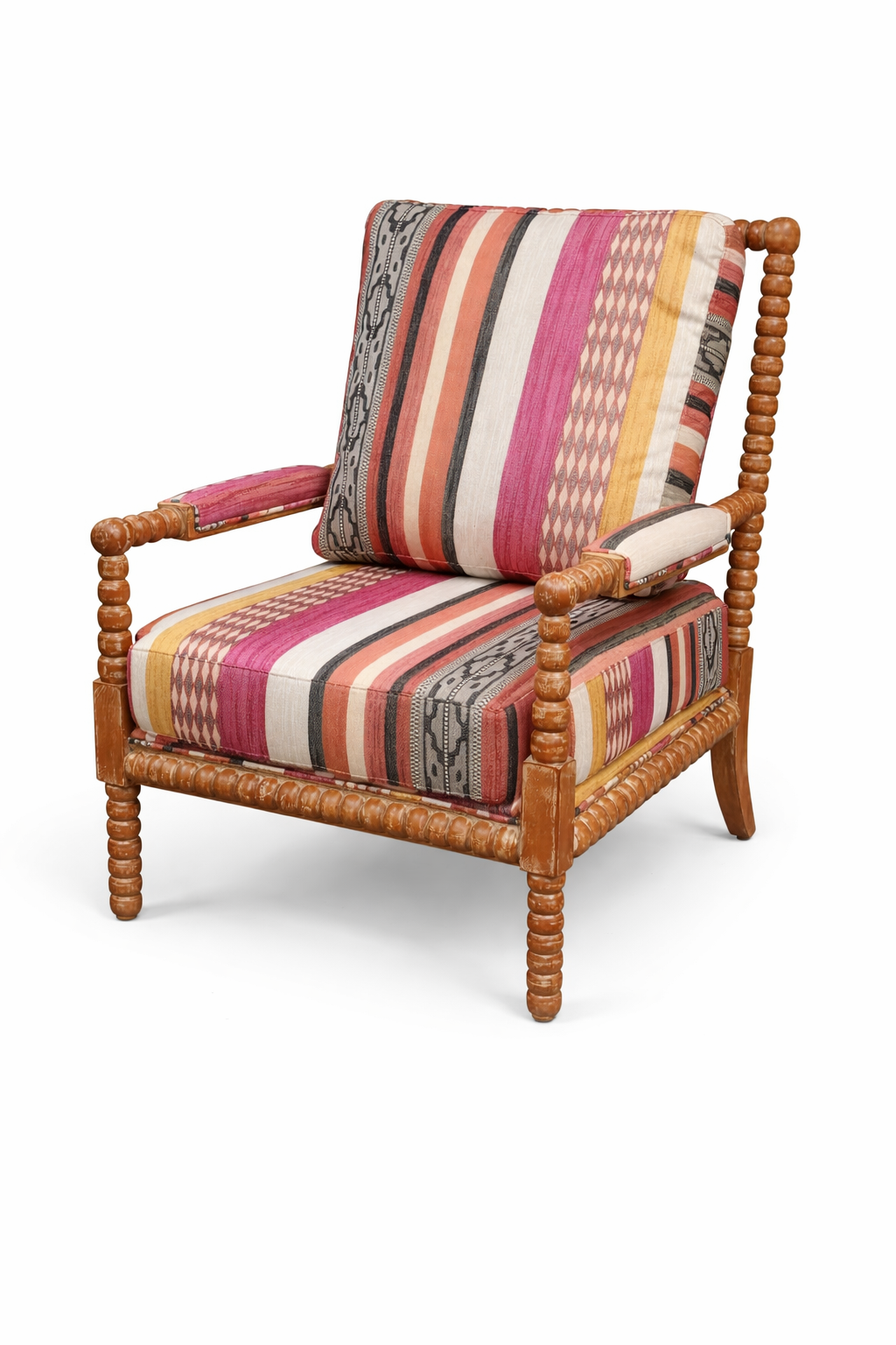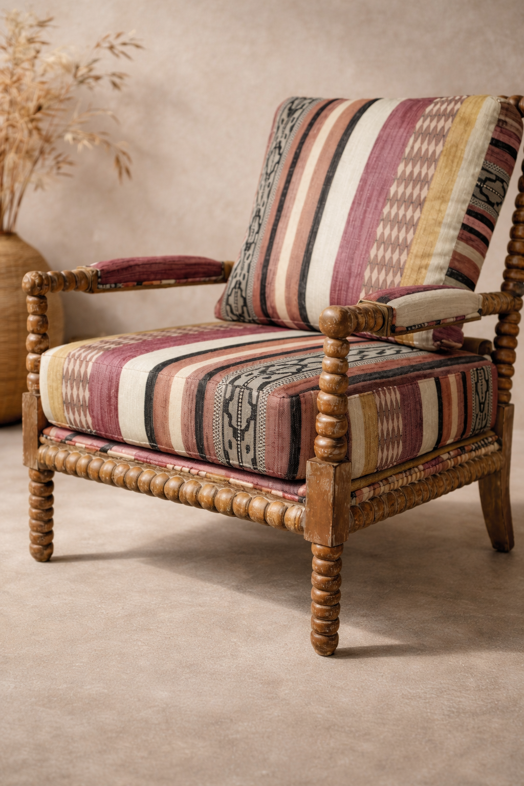 Zanaatkârlığın özüne referans veren Craft Berjer, torna işçiliğiyle şekillendirilmiş masif ahşap iskeleti ve karakterli dokuma kumaşıyla güçlü bir malzeme anlatısı kurar; sıcak ton paleti ve ritmik yüzey hareketleri mekâna derinlik kazandırırken, dengeli oranları ve rahat oturum geometrisi sayesinde hem odak noktası hem de rafine iç mekân kurgularında tamamlayıcı bir tasarım objesi olarak konumlanır.