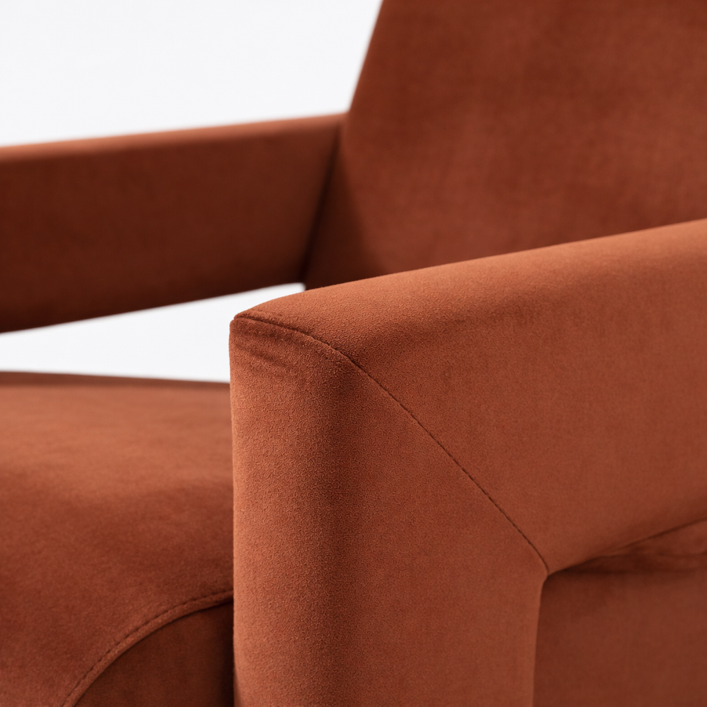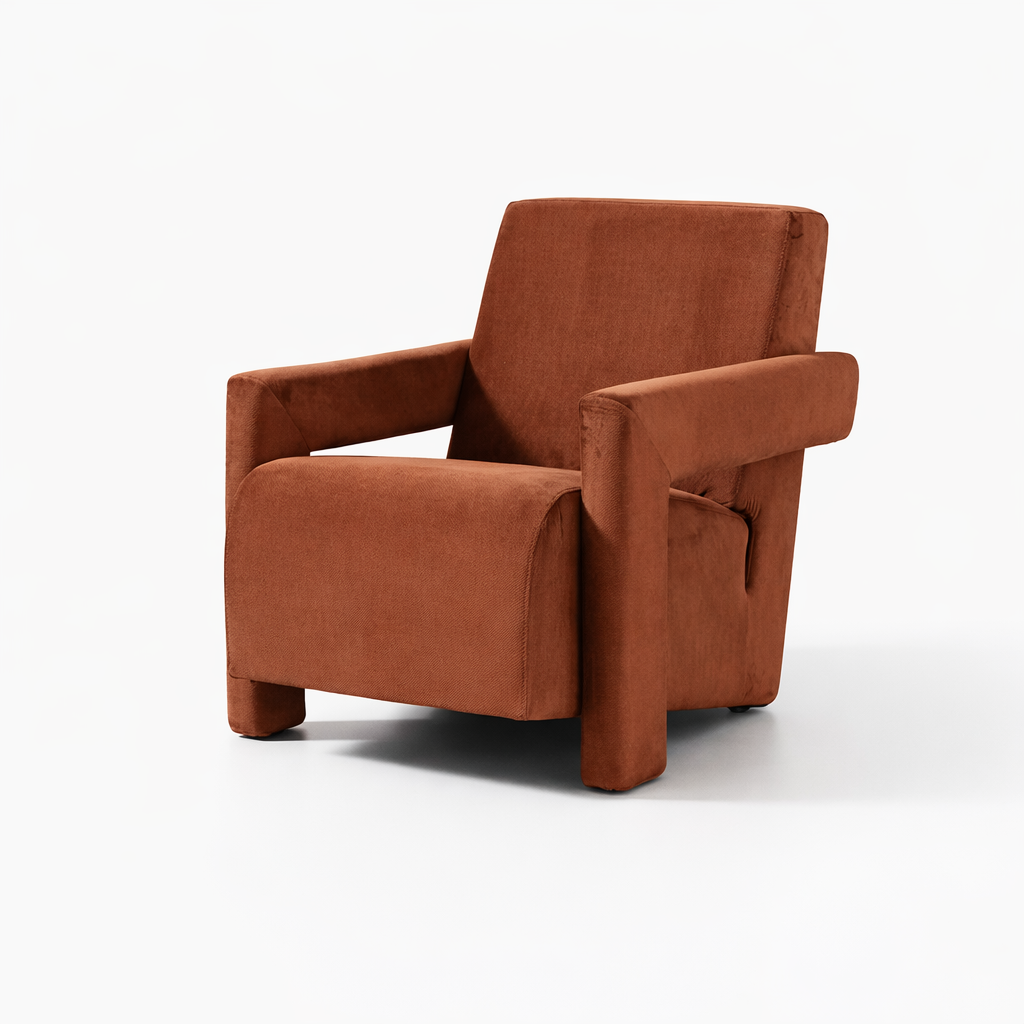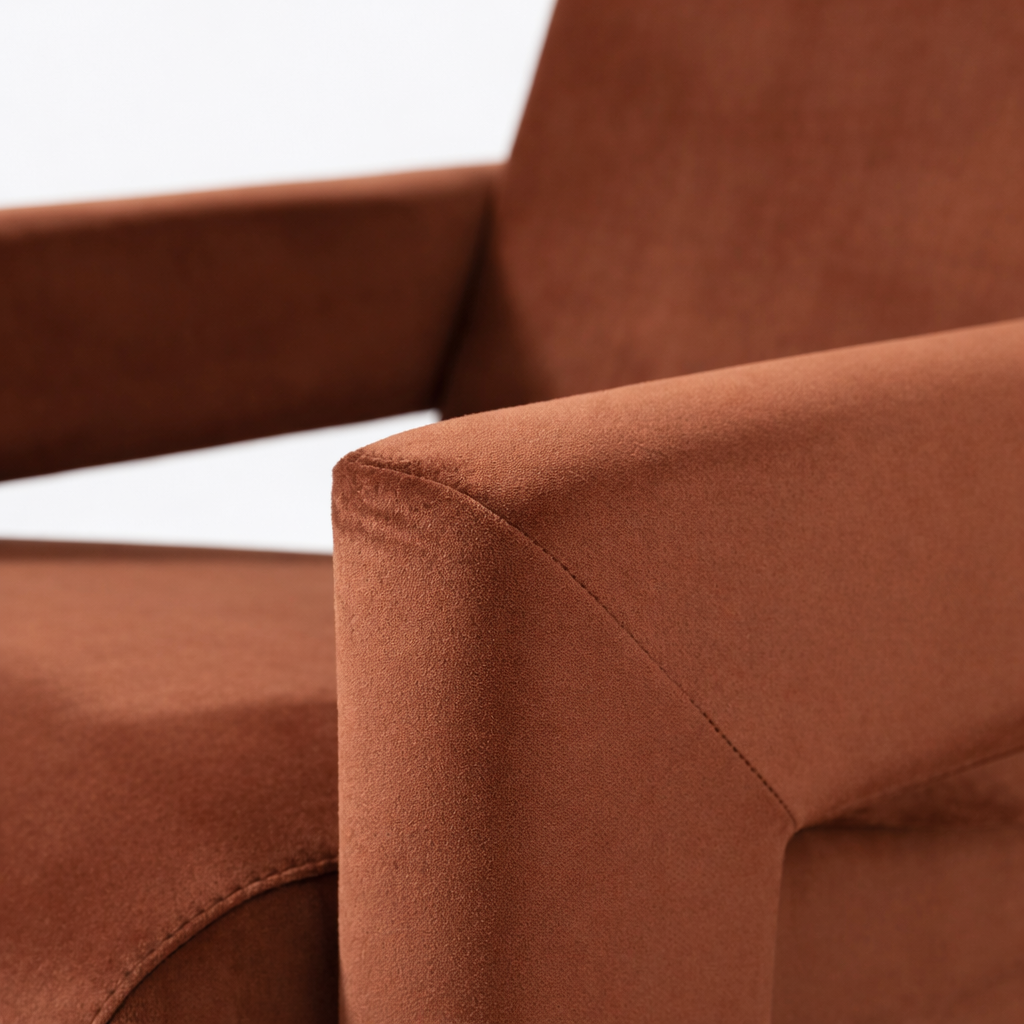 Jetta berjer, güçlü formu ve konfor odaklı yapısıyla modern yaşam alanları için tasarlanmış karakterli bir oturma parçasıdır. Fırınlanmış kayın ağacı ve 1. sınıf kontrplak kullanılarak oluşturulan sağlam iskeleti uzun ömürlü dayanıklılık sağlarken, kiremit tonundaki kumaşı mekâna sıcak ve sofistike bir atmosfer kazandırır. Kumaş kaplı ahşap ayaklar tasarımın bütünlüğünü koruyarak modern silueti destekler. Oturum bölümünde kullanılan 30 dansite sünger ve 25 dansite kuş tüyü dolgu kombinasyonu ise hem yumuşak hem de destekleyici bir konfor sunar. Keskin hatlı formu ve güçlü duruşuyla Jetta berjer, salon, lounge ve özel yaşam alanlarında estetik ile ergonomiyi bir araya getiren iddialı bir tasarım olarak öne çıkar.